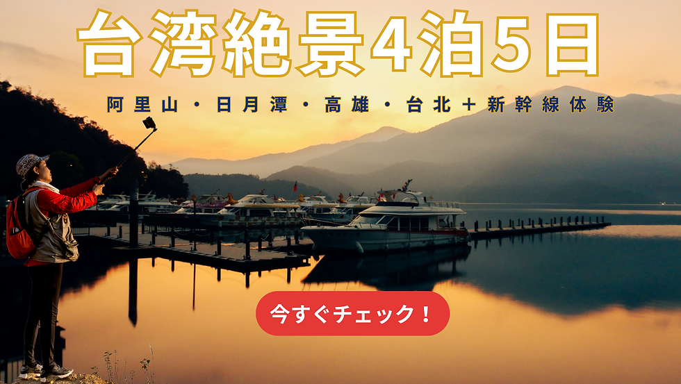阿里山の自然散策から日月潭の湖畔散歩、高雄・台北の人気観光地まで、4泊5日で台湾の魅力をぎゅっと凝縮したモデルコースです。新幹線乗車体験付きで、移動も快適。初めての台湾周遊旅行にぴったりのプランです!
